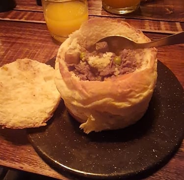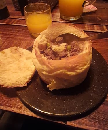 Lá dentro, iluminados suavemente, com o frio lá fora e o aconchego das paredes de pedra ao nosso redor, fomos recebidos com uma refeição típica. Primeiro, uma sopa bem quentinha que parecia abraçar a gente por dentro. Depois, uma cazuela de cordeiro com pão de campo — saborosa, forte, perfeita para a noite fria. E para fechar, mousse de chocolate. Tudo acompanhado de vinho e boas conversas, claro.